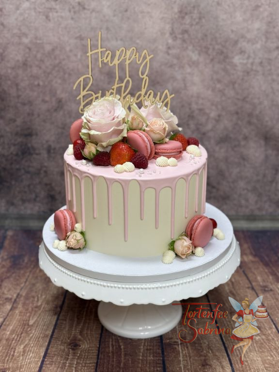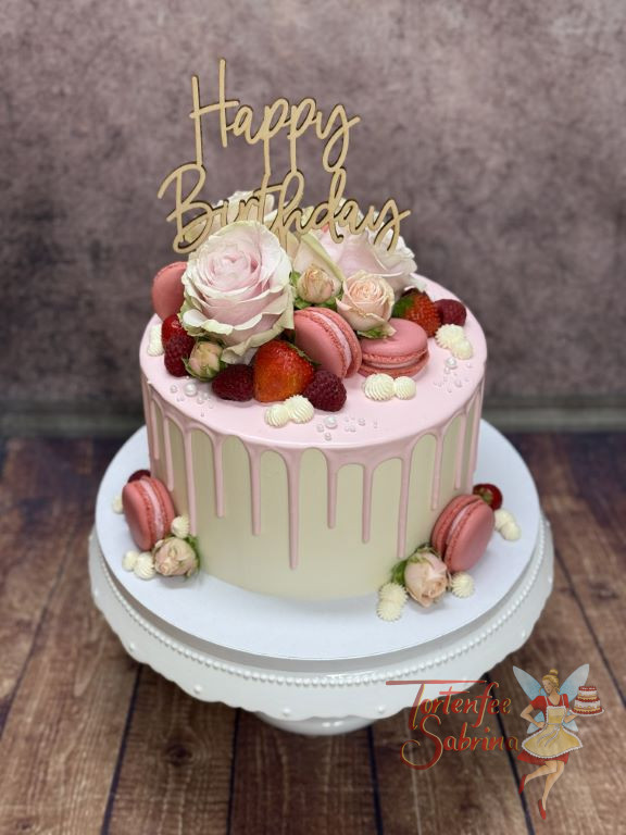 • Geburtstagtorte Erwachsene - Rosa Drip mit Rosen sowie leckeren Macarons verzieren neben dem Caketopper aus Holz die Torte.