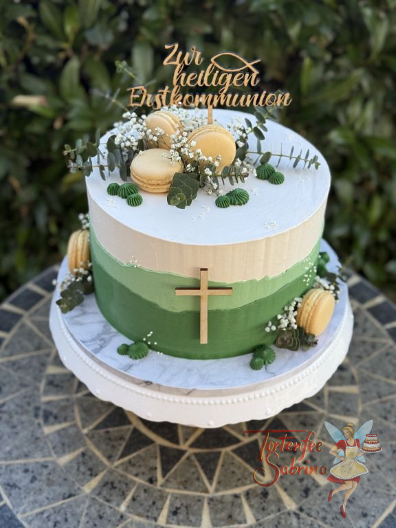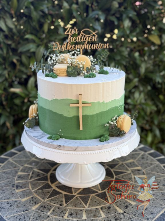Erstkommunionstorte - Mehrere grüne Schichten verzieren in unterschiedlichen Grüntönen seitlich die Torte.