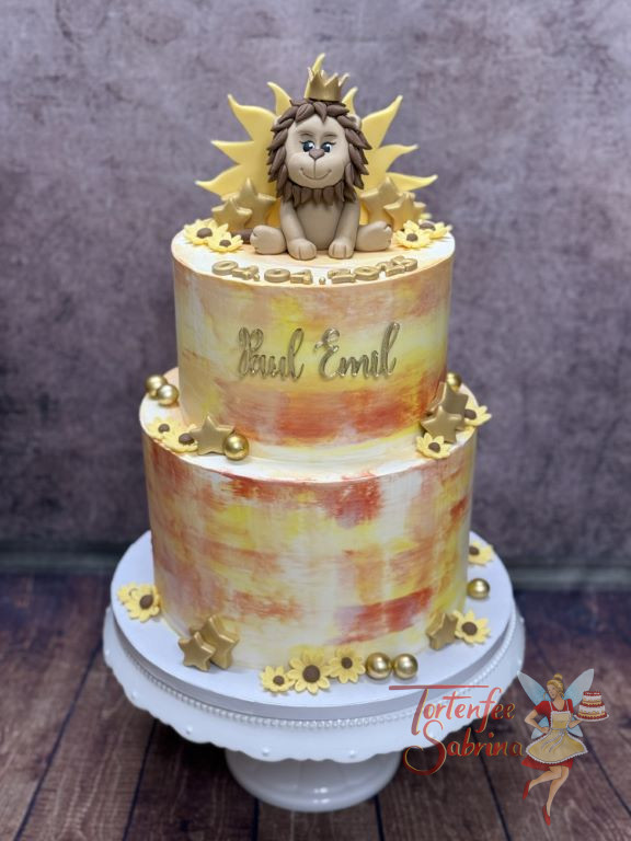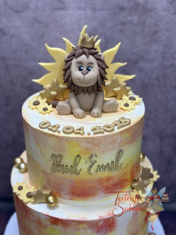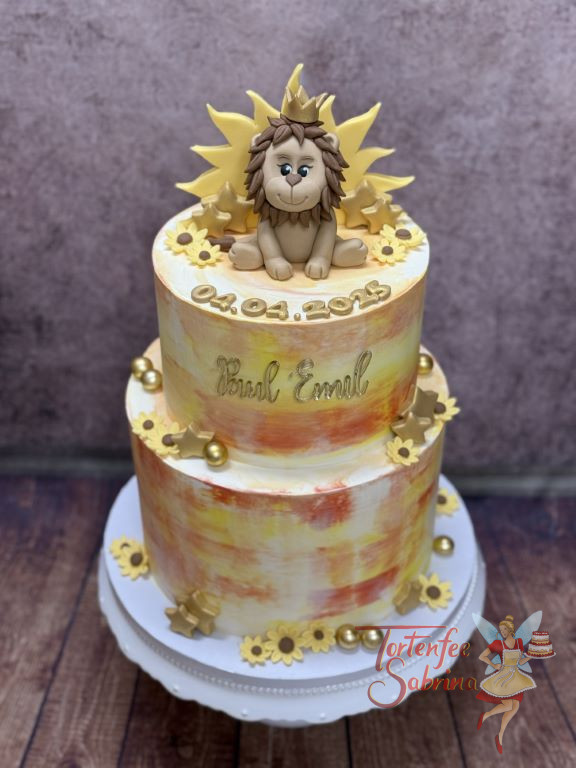 Am Samstag wurde die Taufe von Paul Emil gefeiert und zu diesem besonderen Anlass durfte natürlich eine Torte nicht fehlen. Die Eltern haben sich eine Torte in den Farben gelb, orange und rot gewünscht, mit einem Löwen, Sonne, goldenen Sternen und Sonnenblumen 😊